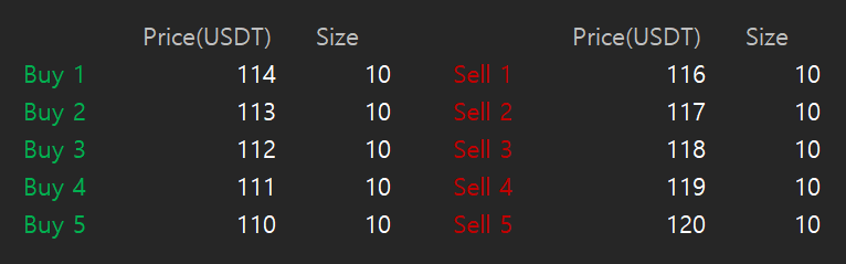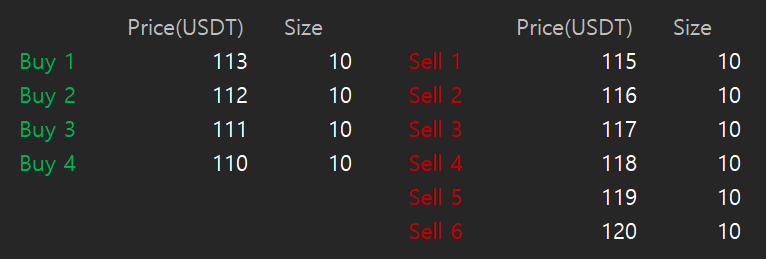 이 코인의 상한선은 110$, 하한선은 120$, 매매 간격은 1$인 그리드 매매를 적용하면 아래 그림과 같이 매수와 매도 주문이 생성된다.